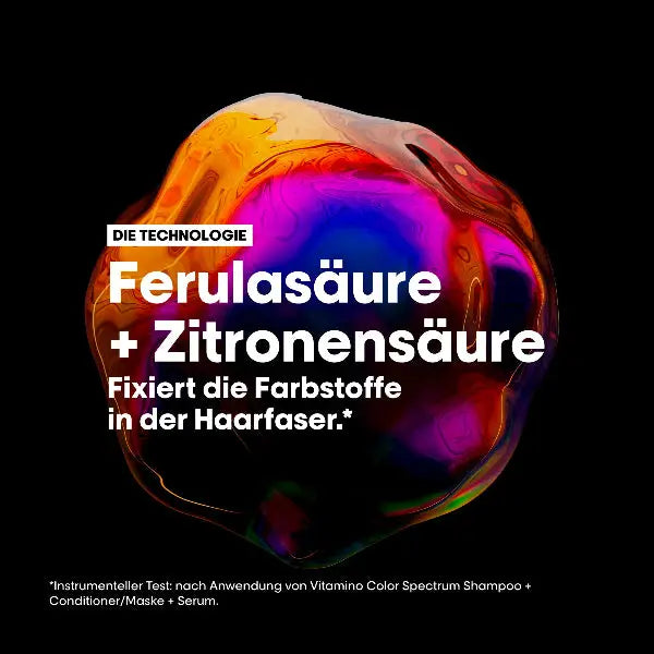 Angereichert mit Ferulasäure und 2,5% Zitronensäure, hilft dieser Conditioner, die Farbpigmente im Haar einzuschließen und die Brillanz in allen 5 Farbdimensionen zu erhalten (bestätigt durch einen instrumentellen Test nach vierwöchiger Anwendung der vollständigen Vitamino Color Spectrum Routine).