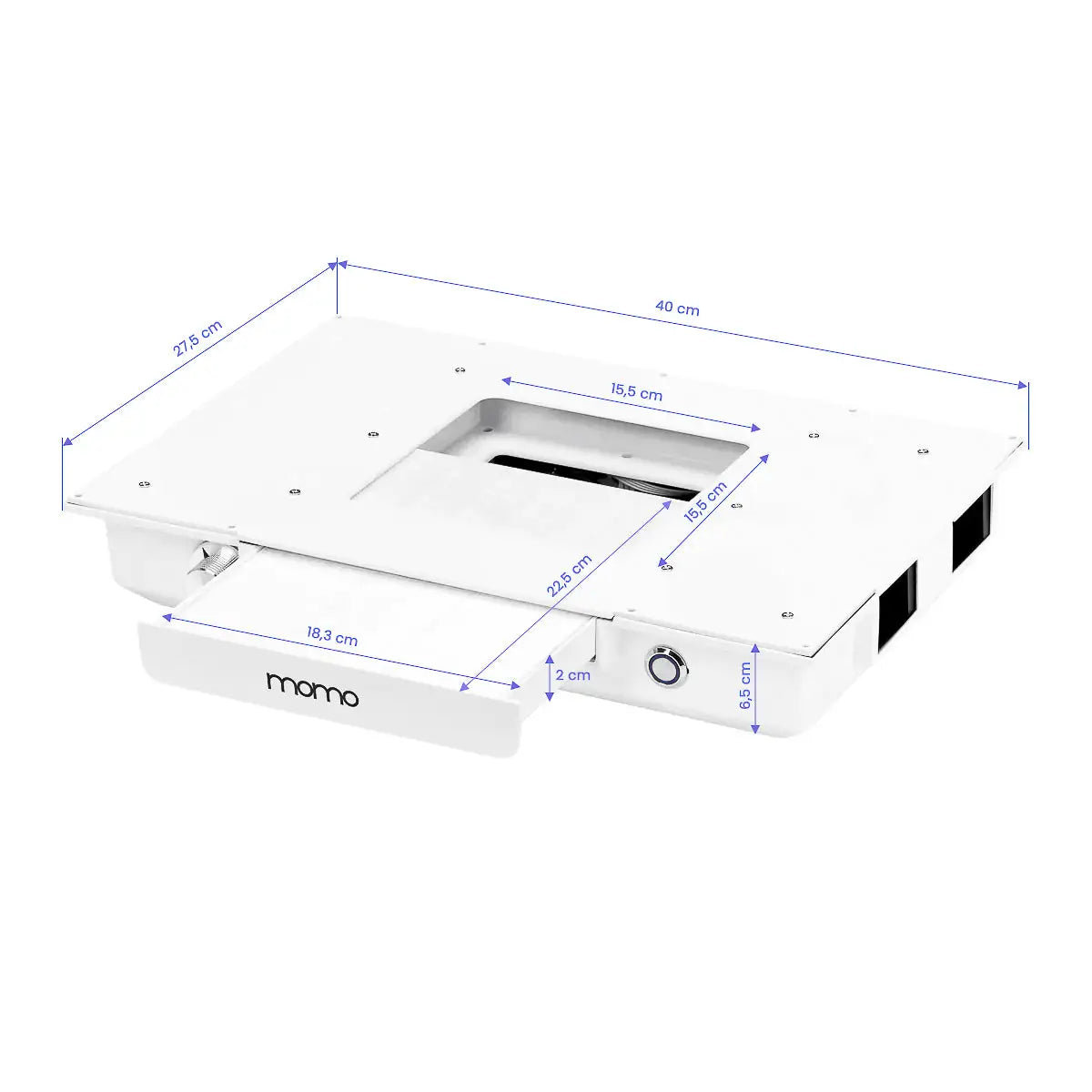 Der in die Arbeitsplatte eingebaute Kassetten-Staubabscheider Momo J-02 verbessert den Arbeitskomfort und die Hygiene erheblich und entfernt effektiv den Staub, der bei kosmetischen Behandlungen, wie z. B. Maniküre, entsteht. Mit diesem Gerät bleibt die Luft im Salon sauber und der Arbeitsplatz frei von Schadstoffen, was die Sicherheit sowohl für die Kosmetikerin als auch für die Kunden erhöht. Der Staubabscheider ist einfach zu bedienen und zu warten, was seine Funktionalität weiter erhöht. Regelmäßige Reinigung und Filterwechsel sorgen für eine gleichbleibend hohe Absorptionseffizienz. Es ist möglich, zusätzliche Ersatzfilter (SKU 123581) zu erwerben. Unser Geschäft bietet auch einen Aktivkohlefilter (SKU 123582), der Allergene und Mikroorganismen effektiv beseitigt und das Hygieneniveau im Salon erhöht.