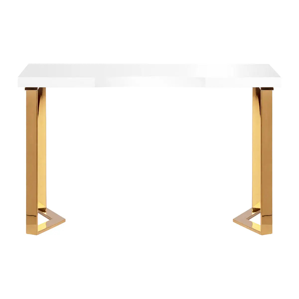 Die moderne Form des Kosmetiktisch, die eine weiße Platte mit goldenen, geometrischen Beinen kombiniert, verleiht dem Interieur Leichtigkeit und Eleganz. Dank seiner kompakten und dennoch stilvollen Form eignet sich der Kosmetiktisch sowohl für kleine Büros als auch für größere, moderne Innenräume.