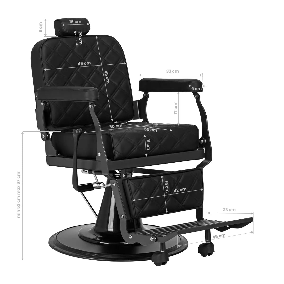 Die solide Basis sorgt für Stabilität und hohen Nutzungskomfort. Die Sitzfüllung aus verformungsbeständigem Schaumstoff und die Polsterung aus angenehm anzufassendem Kunstleder mit mattem Finish sorgen für Langlebigkeit und Komfort. Diese Materialien sind feuchtigkeitsbeständig, strapazierfähig und leicht zu reinigen. Der schwarze Farbe verleiht dem Stuhl einen einzigartigen Charakter, und sein eleganter Stil passt perfekt zu jeder Friseureinrichtung.