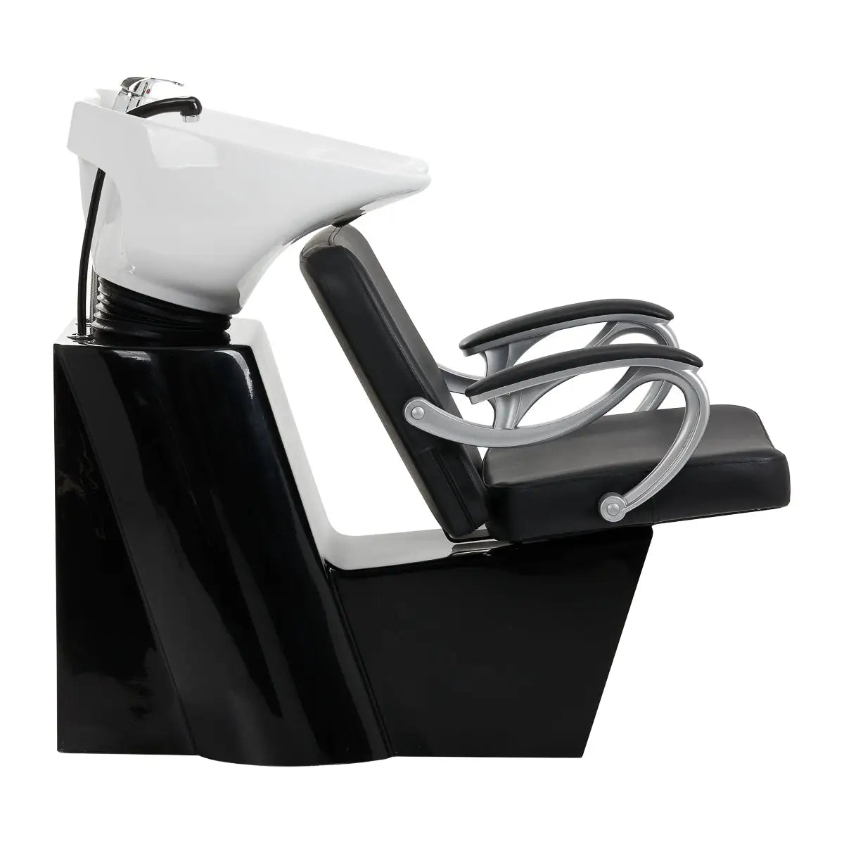 Die entsprechende Tiefe der Waschtischschale aus weißer Keramik verhindert ein übermäßiges Spritzen von Wasser und Produkten, die während der Behandlung verwendet werden. Somit ermöglicht es eine komfortable und effektive Durchführung einer breiten Palette von Dienstleistungen. Die bewegliche Natur der Schale ermöglicht es Ihnen, den Neigungswinkel leicht an Ihre individuellen Bedürfnisse anzupassen. Das verwendete Material macht das Waschbecken langlebig, resistent gegen Verfärbungen und Kratzer und sehr leicht sauber zu halten. Ein richtig profilierter Kragen bietet optimalen Halt und Komfort beim Haarewaschen, und eine bequeme Kunststoffauflage in Schwarztönen sorgt dafür, dass der Kunde keine Unannehmlichkeiten im Zusammenhang mit der Kälte der Keramikoberfläche verspürt.